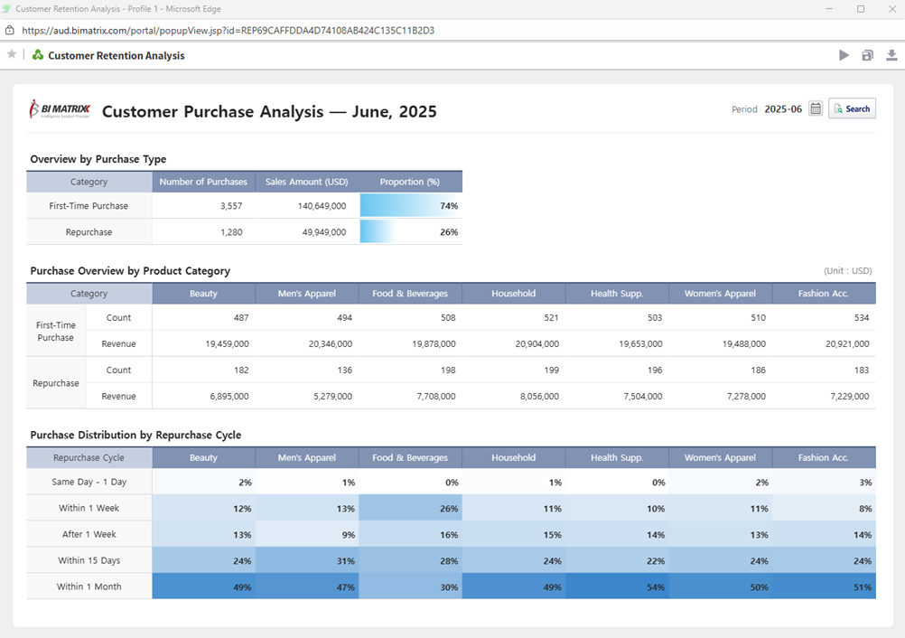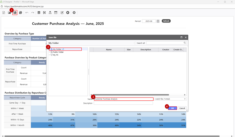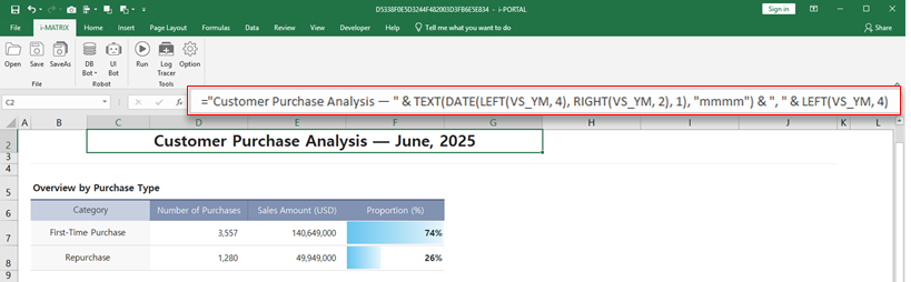 ="Customer Purchase Analysis — " & TEXT(DATE(LEFT(VS_YM, 4), RIGHT(VS_YM, 2), 1), "mmmm") & ", " & LEFT(VS_YM, 4) The report setup is complete. Click 'Save' in the i-MATRIX ribbon menu or press Ctrl+S to save, then return to the AUD Designer screen.