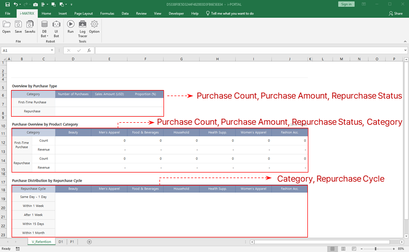 =IF(D2="First-Time Purchase","-",IF(E2<=1,"first",IF(AND(E2>=2,E2<=6),"second",IF(AND(E2>=7,E2<=14),"third",IF(AND(E2>=15,E2<=30),"fourth","fifth"))))) - After entering the formula in row 2, click 'Run' from the i-MATRIX ribbon menu, and the formula will automatically fill down to cover the area with DB data.
