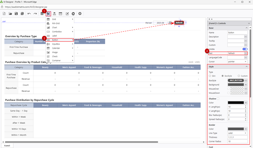 * Ensure that DataFormat matches both the DB data and the variable values defined in Excel. (yyyyMM → yyyy-MM) - Finally, add the ‘Refresh’ button to the designer.