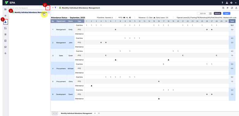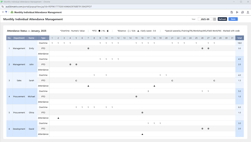 This report provides real-time consolidation and management of employee monthly attendance records by department.