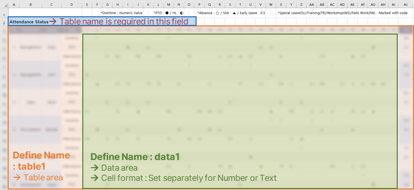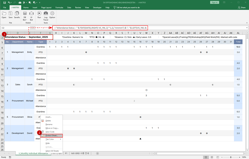 Formula : = "Attendance Status ─" & TEXT(DATE(1,RIGHT( VS_YM, 2) * 1,1),"mmmm") & ", " & LEFT(VS_YM, 4) - Hide any rows that should not appear on the screen, re-enable sheet protection.