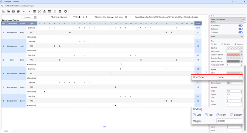 To remove the border from the report on the designer screen, set the Line Type property under Border to ‘None’.