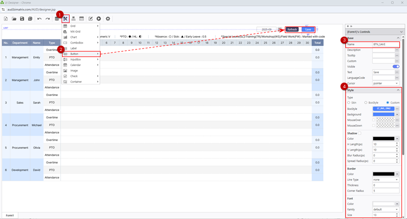 - To save the entered data to the database, connect to the DB and configure the Save and Refresh buttons.