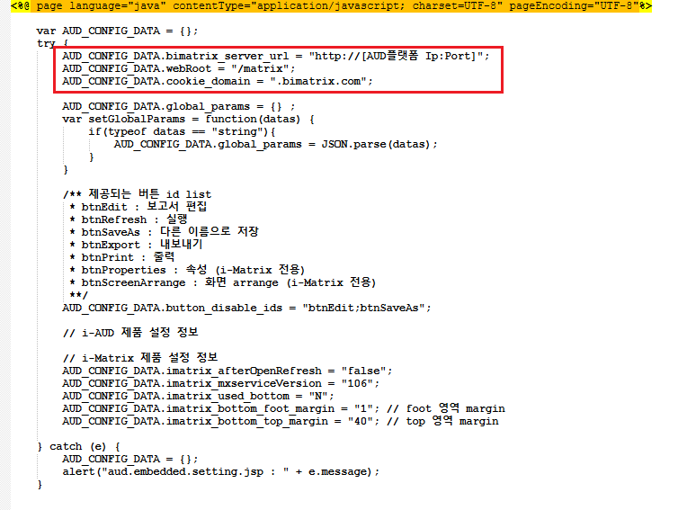 - bimatrix_server_url 설정 : AUD플랫폼의 IP:PORT + Context Root로 설정