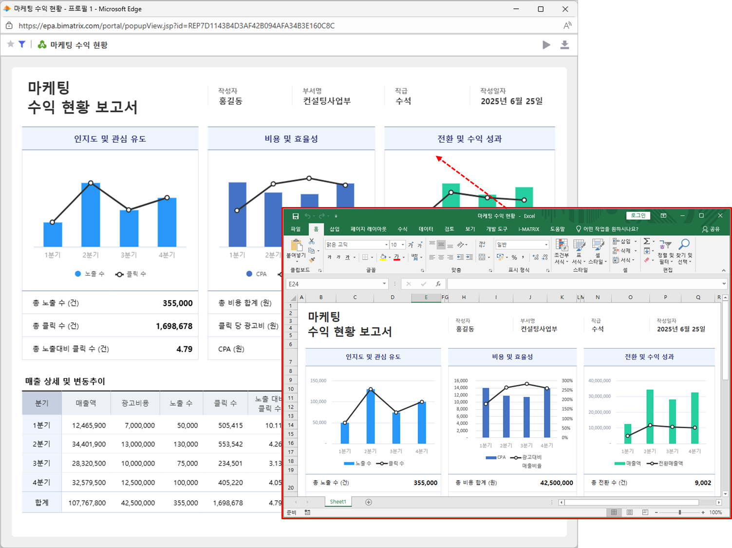 엑셀 보고서가 웹 화면에 그대로 반영된 것을 확인할 수 있습니다.
