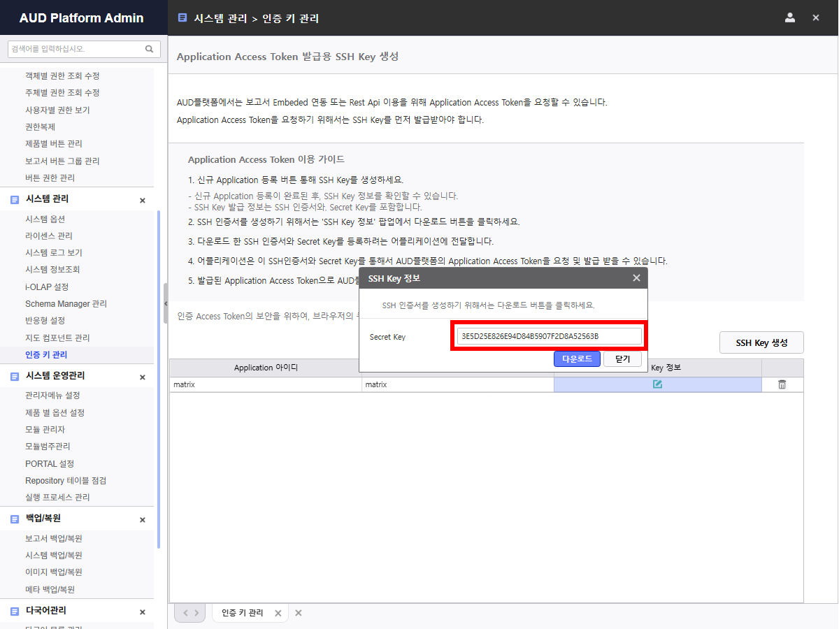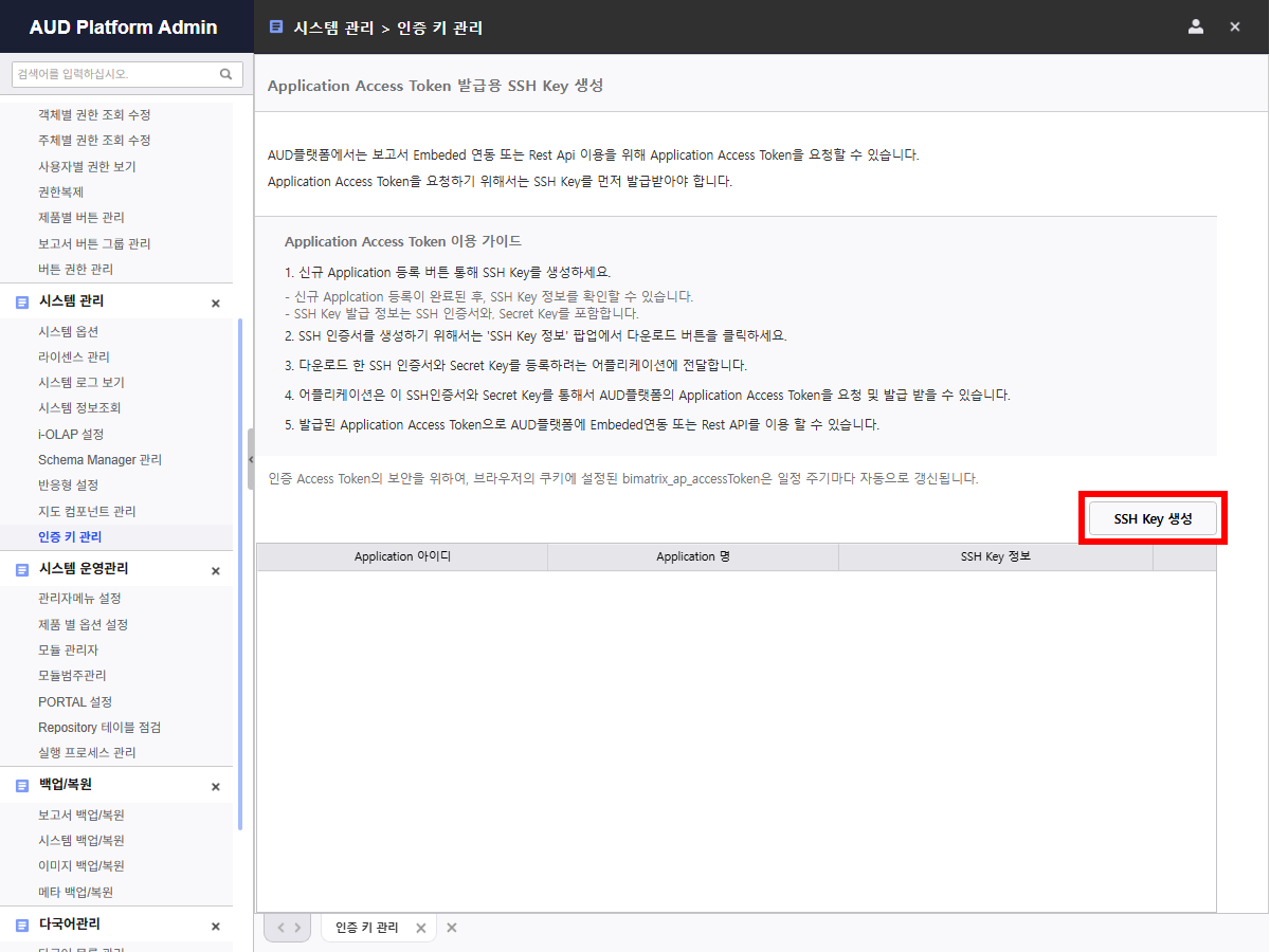 > Admin 시스템 운영관리 > 인증 키 관리 > SSH Key 생성