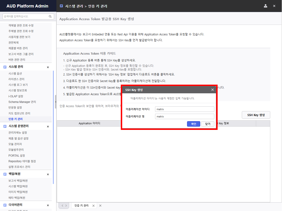> Admin 시스템 운영관리 > 인증 키 관리 > SSH Key 생성