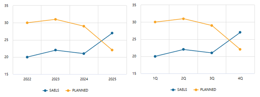 // 초기 DataSet var ds = Matrix.CreateDataSet(); var dt = ds.CreateTable('T1'); dt.AddColumn('YYYY', false); dt.AddColumn('SAELS', true); dt.AddColumn('PLANNED', true); dt.AppendRow('2022,20,30', ','); dt.AppendRow('2023,22,31', ','); dt.AppendRow('2024,21,29', ','); dt.AppendRow('2025,27,22', ','); CHART.SetDataSet(ds); // 교체할 DataSet var ds = Matrix.CreateDataSet(); var dt = ds.CreateTable('T1'); dt.AddColumn('QUTR', false); dt.AddColumn('SAELS', true); dt.AddColumn('PLANNED', true); dt.AppendRow('1Q,20,30', ','); dt.AppendRow('2Q,22,31', ','); dt.AppendRow('3Q,21,29', ','); dt.AppendRow('4Q,27,22', ',');- SetXAxisSeries Script API 기능을 사용하면, 파라미터로 전달할 이름으로 된 계열이 있는 경우, 해당 계열을 X 축의 기준으로 설정하고,