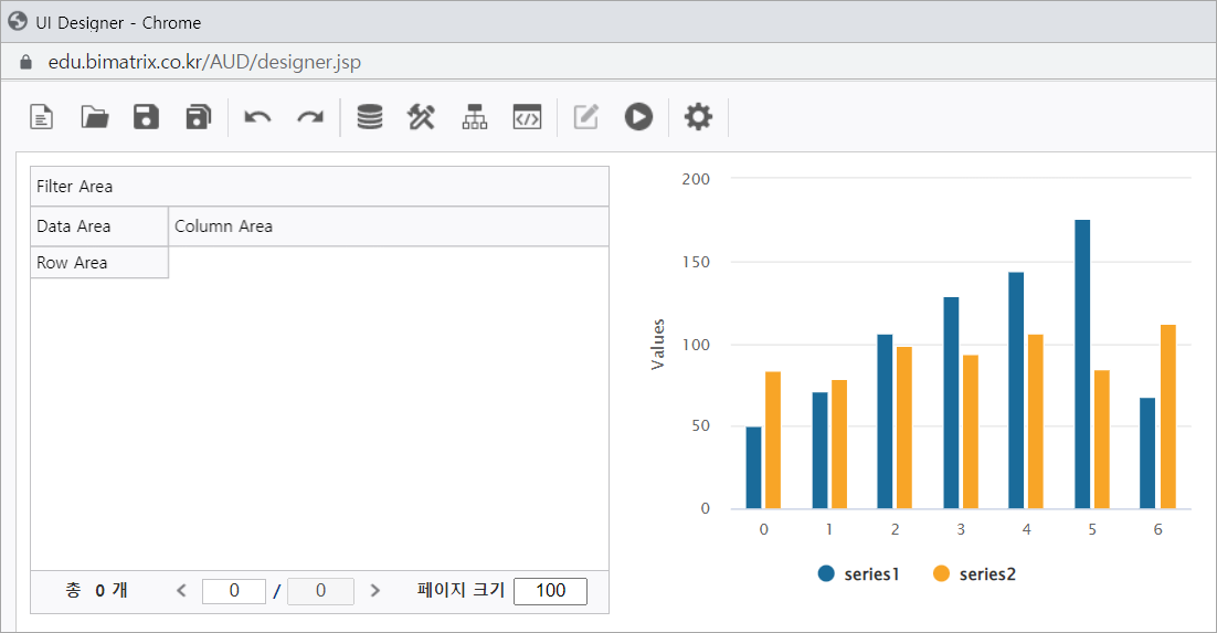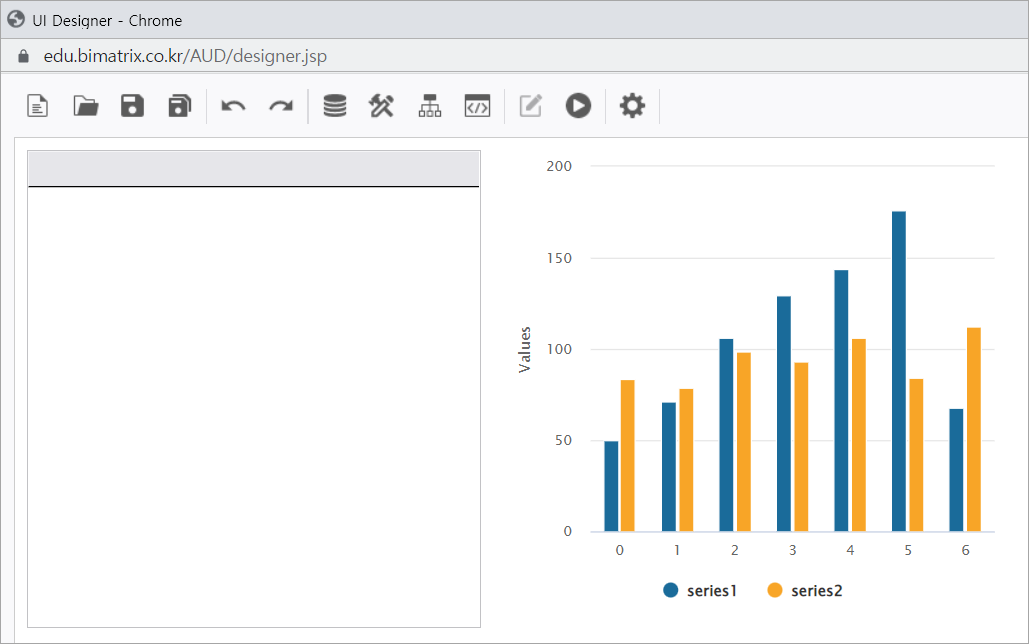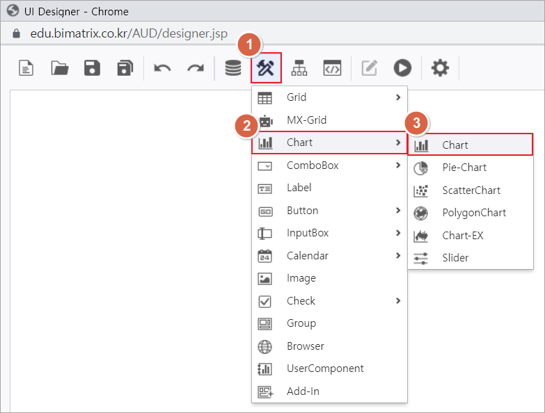 1. i-AUD Designer 창 컨트롤 그룹에서 UI Bot → Chart 목록을 클릭하여 Chart 컨트롤을 화면에 배치합니다.