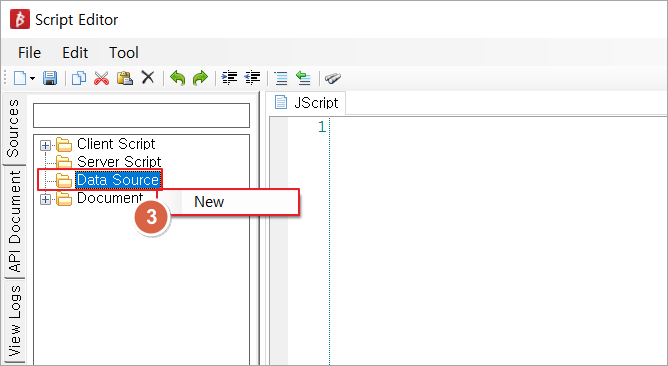 2. Script Editor창이 실행되면 왼쪽 Data Souce 폴더를 마우스 우 클릭 하여 New를 선택합니다.