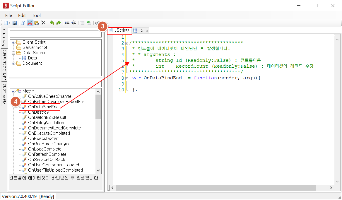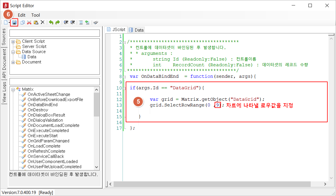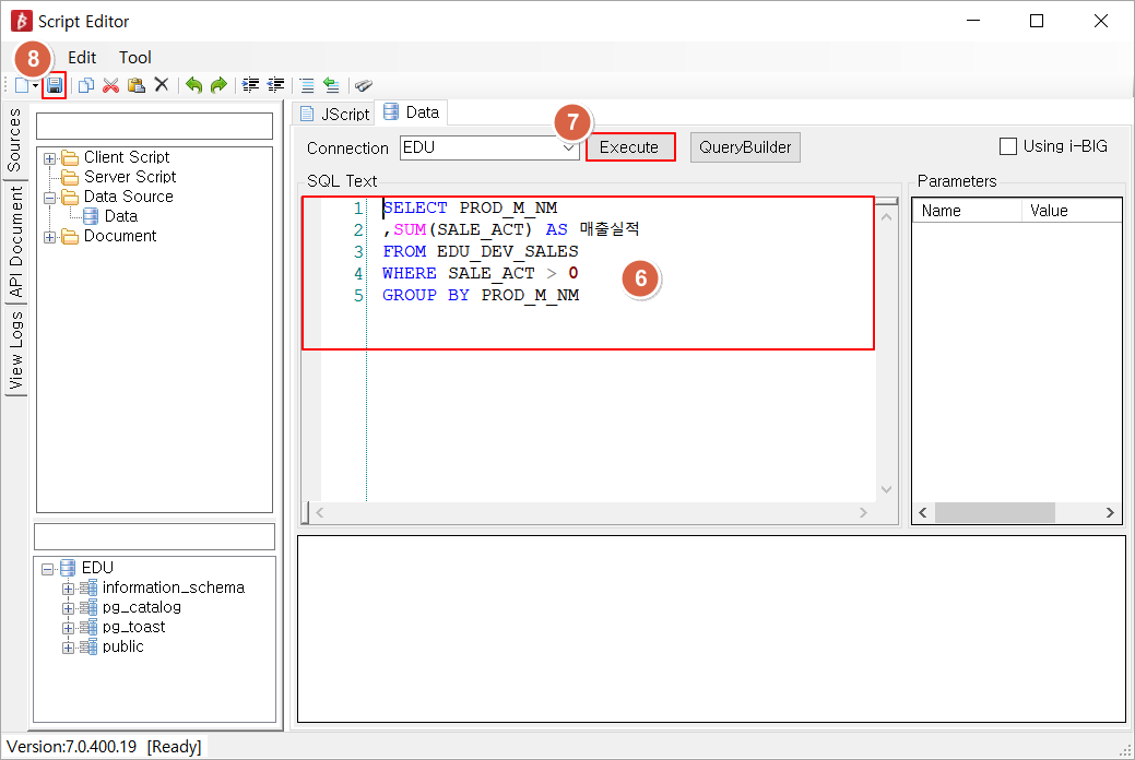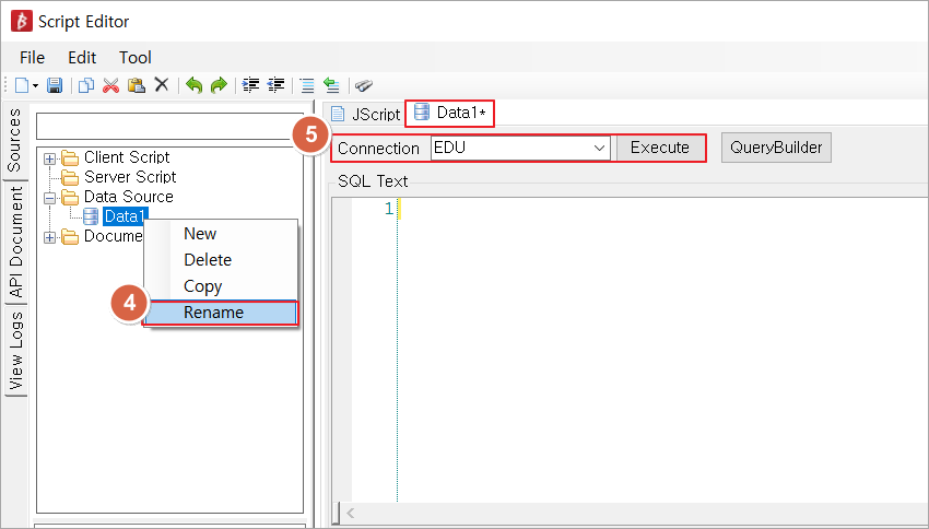 - 편집 그룹→ Script Editor에 Data Source를 이용하시는 방법도 있습니다. ( SQL 바인딩 참조)