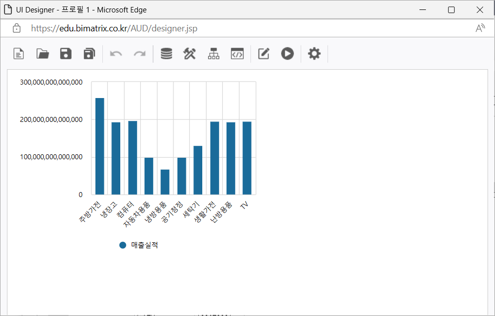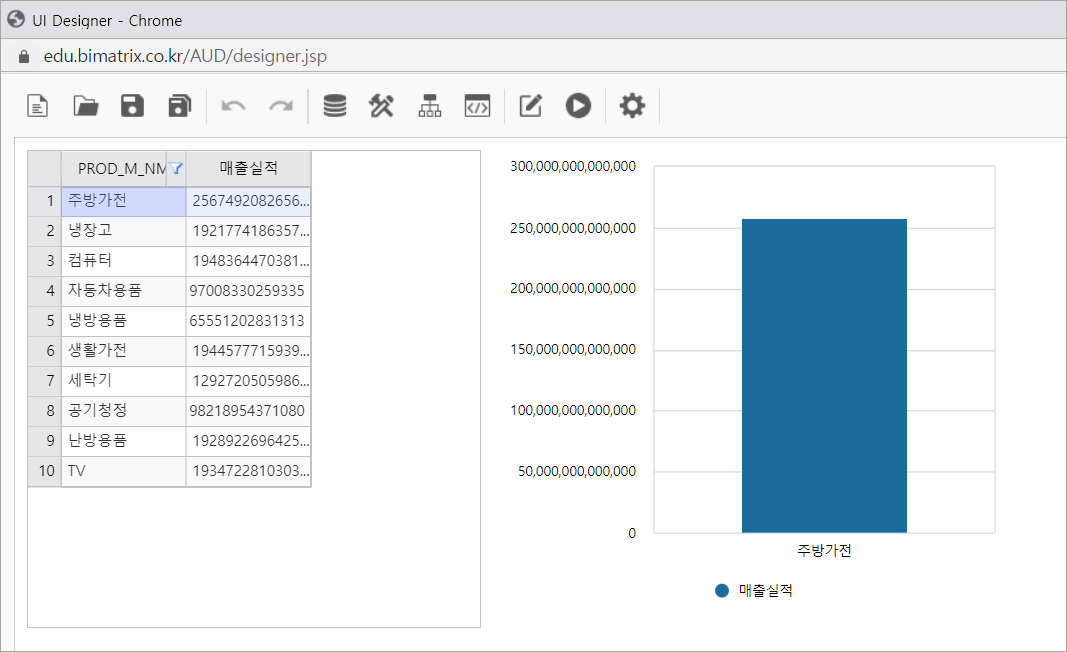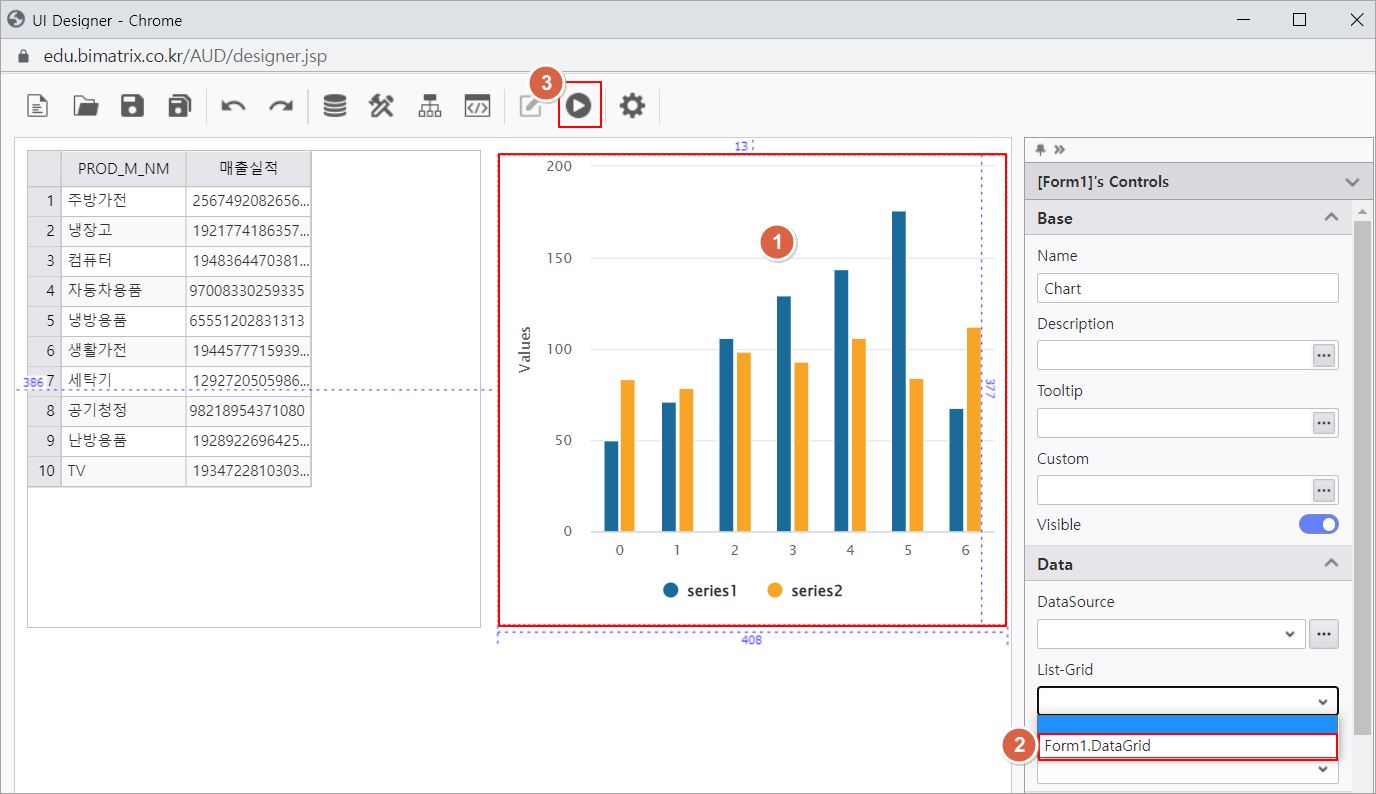 3. 실행 버튼을 클릭하여 Chart 컨트롤에 List-Grid에서 지정한 영역의 데이터가 바인딩된 것을 확인합니다.