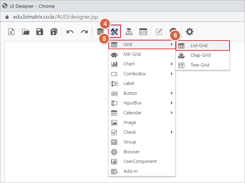 2. i-AUD Designer 창 컨트롤 그룹에서 UI Bot → Grid 목록을 클릭하여 List-Grid 컨트롤을 화면에 배치합니다.