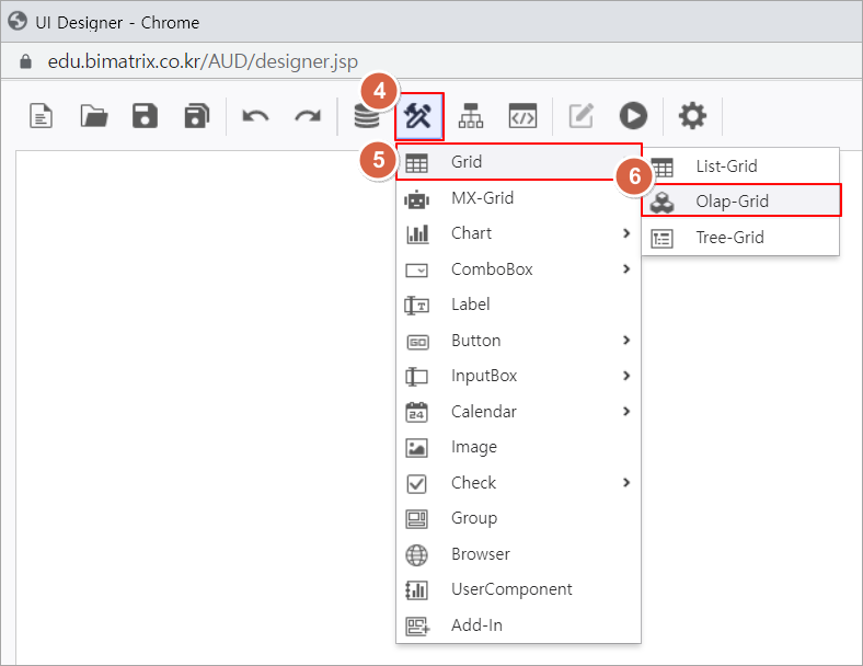 2. i-AUD Designer 창 컨트롤 그룹에서 UI Bot → Grid 목록을 클릭하여 Olap-Grid 컨트롤을 화면에 배치합니다.