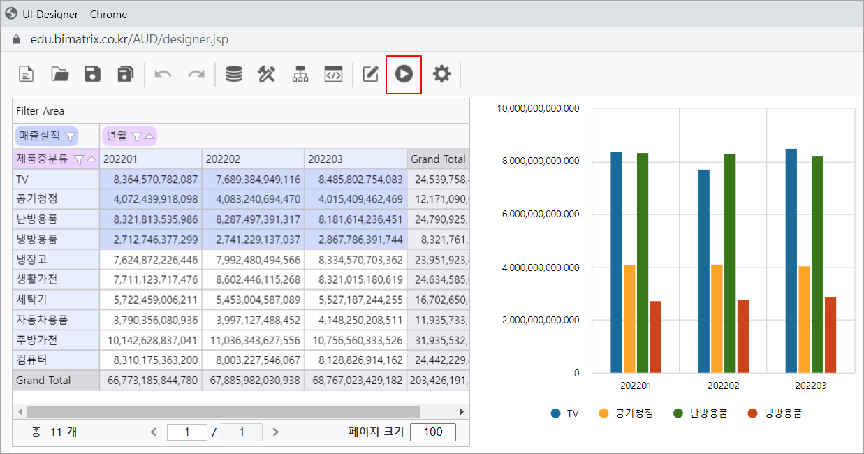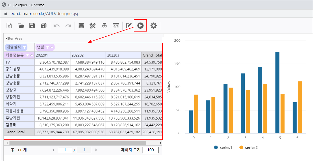 3. 실행 버튼을 클릭하여 Chart 컨트롤에 Olap-Grid에서 지정한 영역의 데이터가 바인딩된 것을 확인합니다.