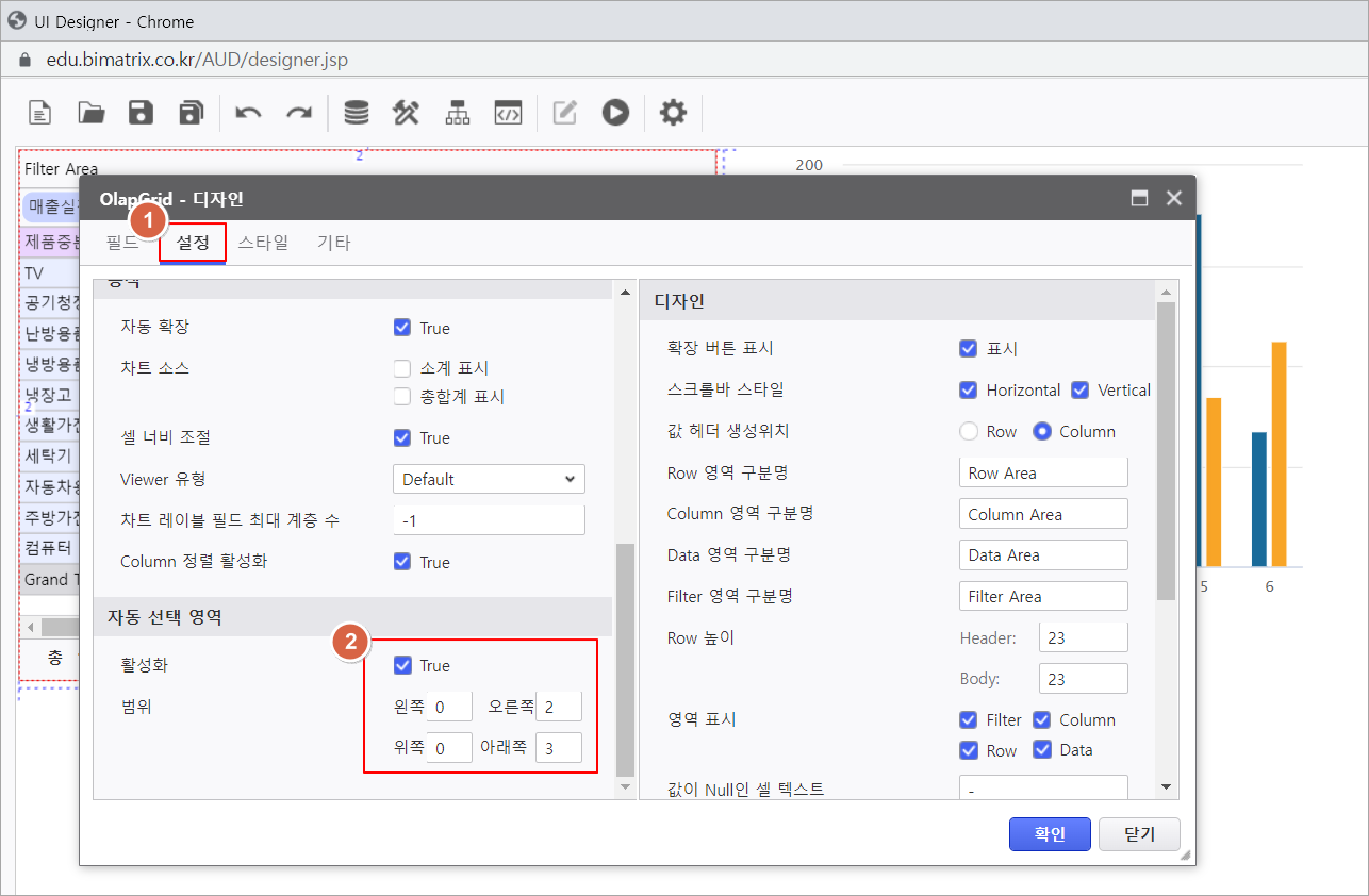 2. 설정 탭 자동 선택 영역에 활성화 체크 후 범위를 지정합니다.