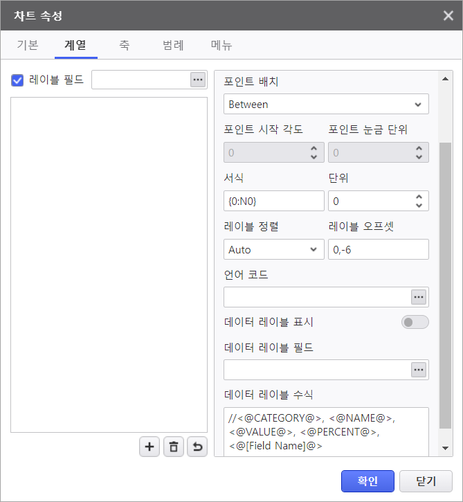 데이터 레이블 필드 | 다른 필드의 값을 레이블로 표현하고 싶을때, 사용할 필드 명 지정 | |||||