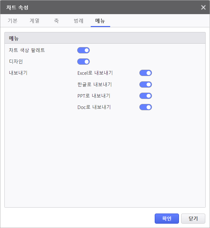 차트 유형 | 실행 모드에서 차트 우 클릭 시, 차트 유형 활성화 여부 설정 |