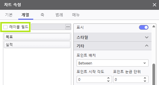 포인트 시작 각도 | 시작 위치(각도) 설정 (계열의 '레이블 필드'가 언체크 된 상태에서만 활성화 됨) | |||||
