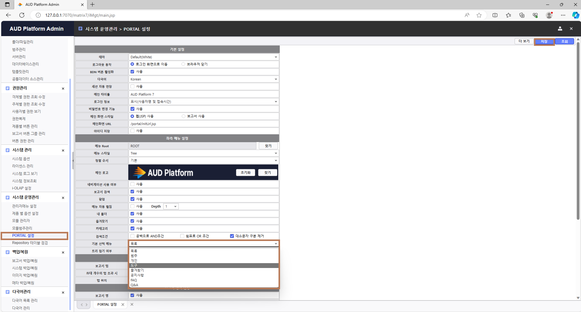 2. PORTAL설정 화면에서 '기본 선택 메뉴' 콤보 박스를 클릭하면 PORTAL의 메뉴 항목이 나타납니다.