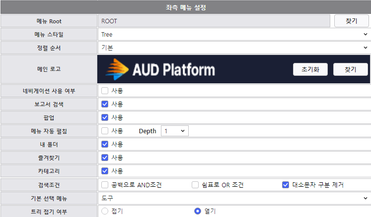 1. 실행 경로 : Admin > 시스템 운영관리> PORTAL설정 > 좌측 메뉴 설정의 '기본 선택 메뉴'