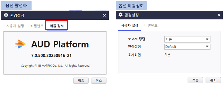 제품 메인 포탈 상단 사용자 환경 설정 사용 여부 옵션