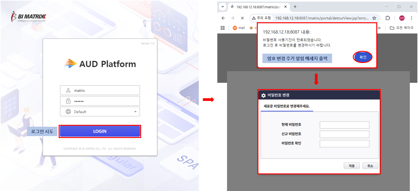 제품 로그인 화면에서 로그인 시도 시 암호 변경 주기가 지났거나 암호가 초기화 된 경우 암호 변경 팝업 창 사용 여부를 설정하는 옵션