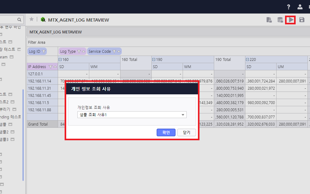 개인정보 포함 보고서 실행 시 개인정보 조회 사유를 설정 할 수 있는 팝업 출력 옵션