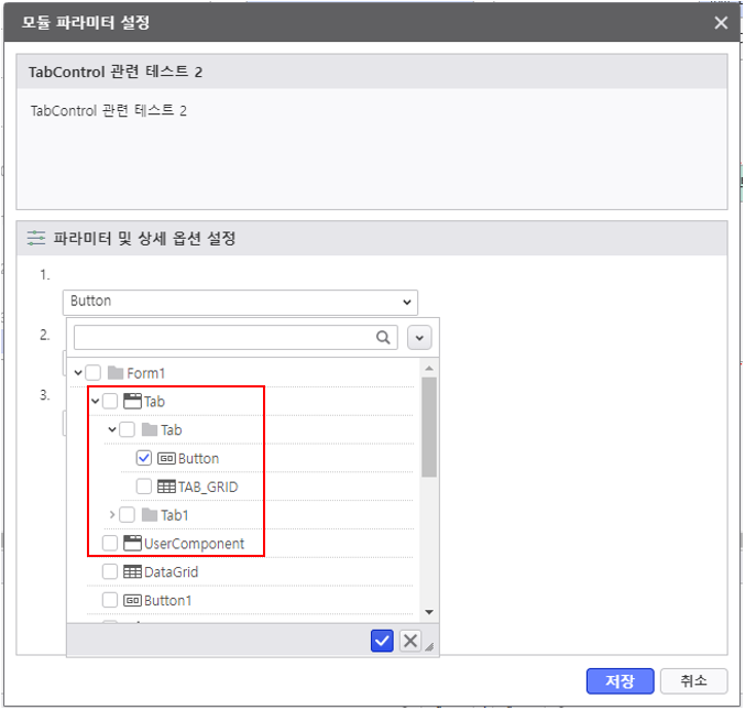 - [모듈 파라미터 설정] 에서 컨트롤 목록 상의 Tab Control 하위 컨트롤과 UserComponent를 선택할 수 있습니다.