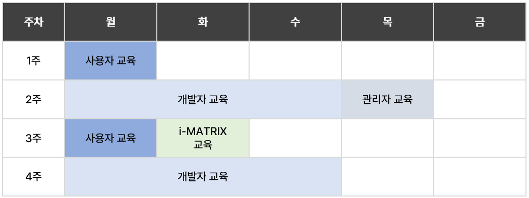| i-MATRIX 교육 | i-MATRIX 개발자 | 1일 | 월 1회(3주) |