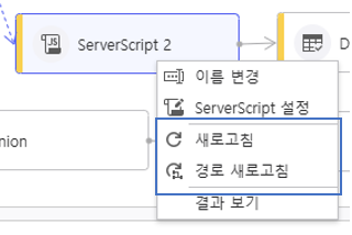 Step 1. Script 노드 경로 새로고침 ServerScript 노드 혹은 PythonScript 노드에 커서를 올려 우클릭 후 새로고침 또는 경로 새로고침을 합니다.