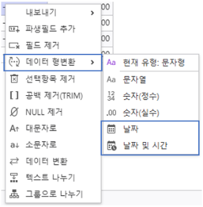 | 설정 | 노드의 데이터 조회 및 전처리 할 수 있습니다. | SaveExcel과 SaveText는 해당 메뉴가 표시되지 않습니다. |