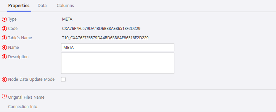 | Properties | ① Original File's Name | 노드와 연결된 i-META 원본의 이름이 출력됩니다. |