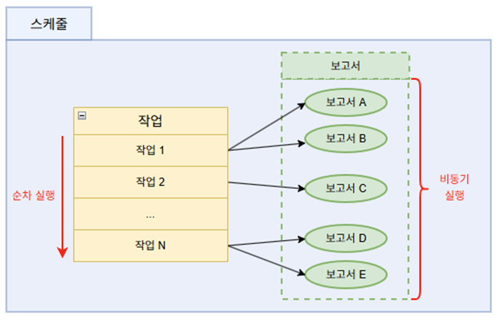 하나의 작업 안에 포함된 여러 개의 보고서는 비동기 방식으로 실행되며, 전체 보고서의 실행이 종료되어야 다음 작업을 실행합니다.