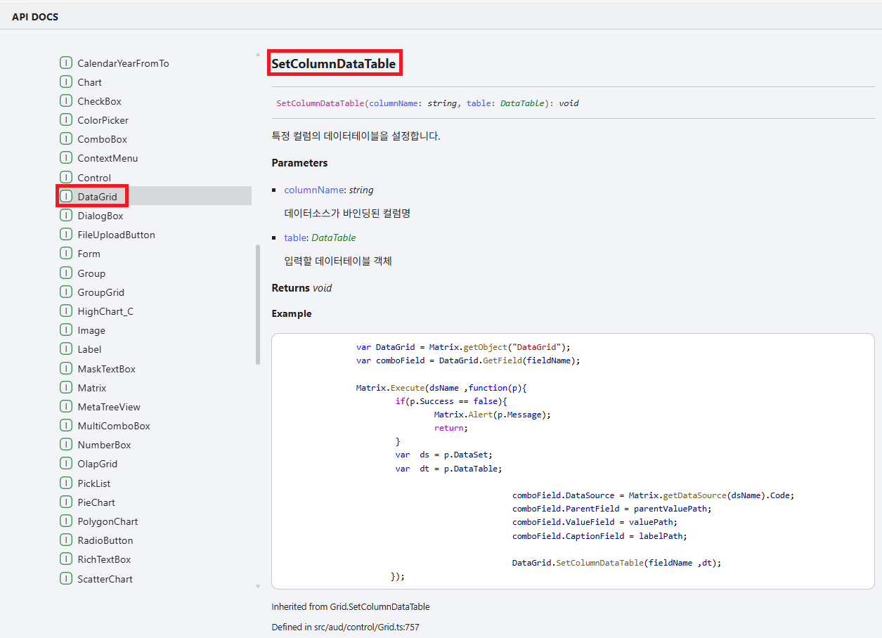 속성 속성명 ParentField 부모 코드 필드 ValueField 코드 필드 CaptionField 표시 필드 API 사용 방법은 {도메인 주소}/help/aud/interfaces/aud.control.DataGrid.html#setcolumndatatable-1 에서 상세하게 확인할 수 있습니다.