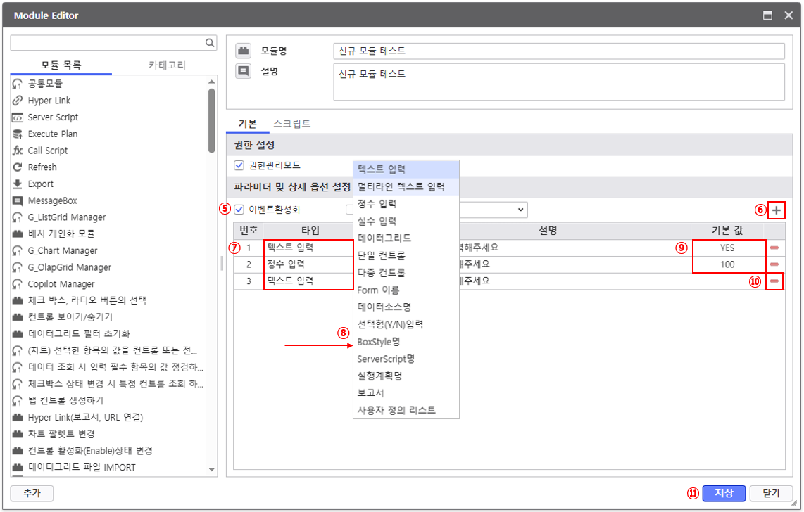 ⑥ 모듈에서 사용할 파라미터 및 상세 옵션 설정 행을 추가합니다.