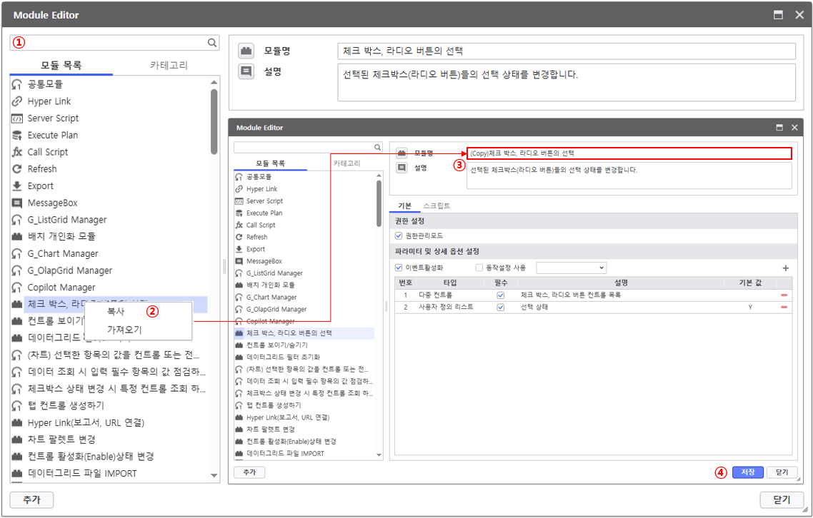 [모듈 목록]에 존재하는 모듈을 복사하여 사용자 정의 모듈로 작성 할 수 있습니다.