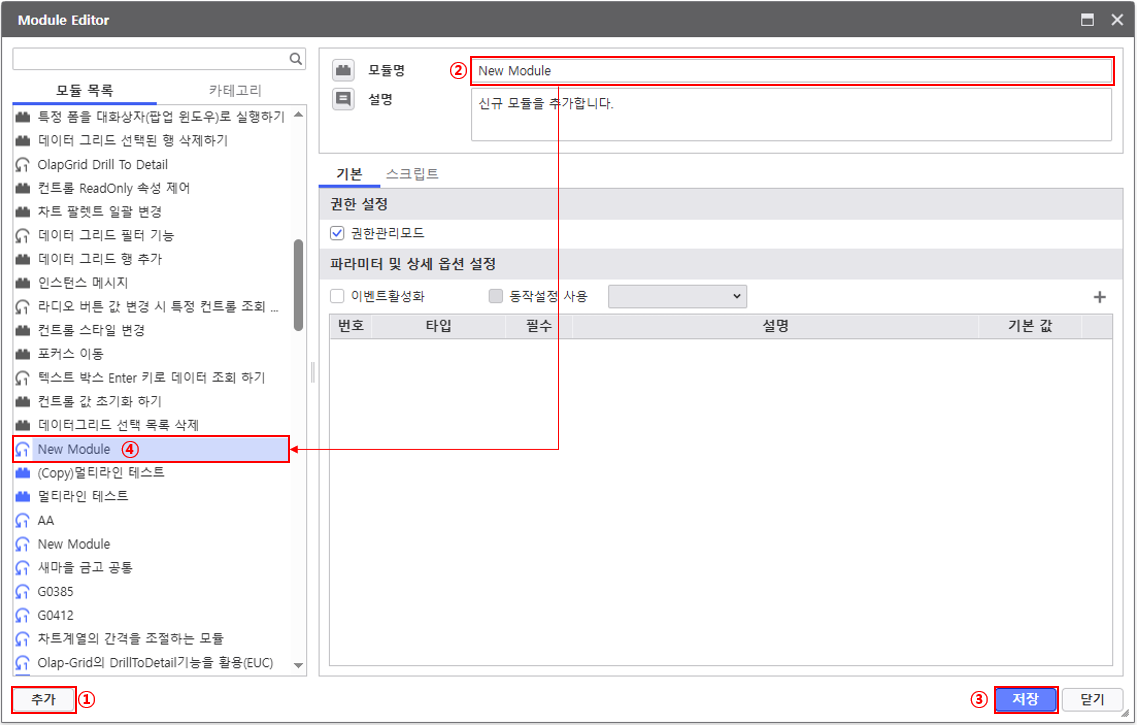 ③ 저장 : 신규 생성된 모듈을 저장합니다.