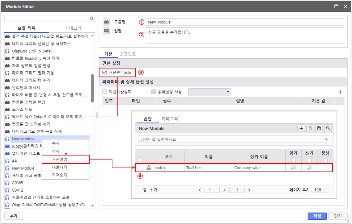 ③ 권한관리모드 : 체크시 [모듈 목록] 에서 사용자 정의 모듈 선택후 오른쪽 버튼 팝업 메뉴에서 [권한설정] 할 수 있습니다