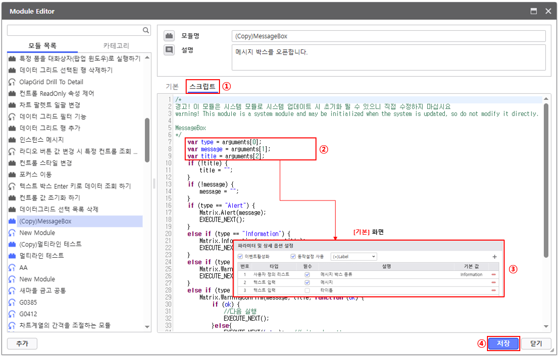 ① 스크립트 : 모듈에서 사용되는 스크립트를 추가/수정 할 수 있습니다.
